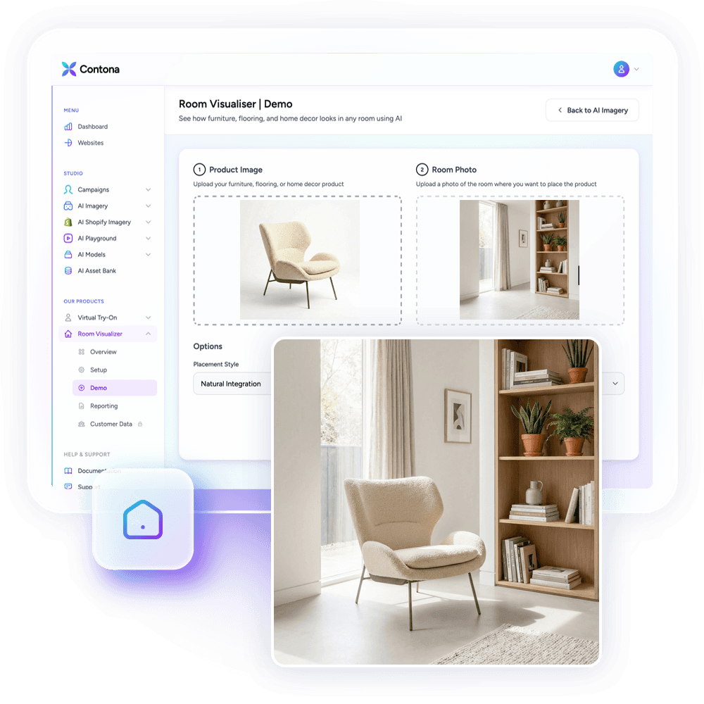 Room Visualizer is designed to sit seamlessly within your existing product pages. The widget matches your brand styling, triggers from a button or product gallery, and loads without slowing down your page. Customers interact with it naturally as part of their shopping journey, no redirects, no separate apps, no friction. It works across all product categories where spatial context matters sofas, tables, shelving, rugs, lighting, wall art, paint colours, and flooring. Pair it with Contona's campaigns to show seasonally themed room scenes, or let customers upload their own space for a fully personalized experience. Every visualization feeds into your analytics so you can see exactly which products benefit most.